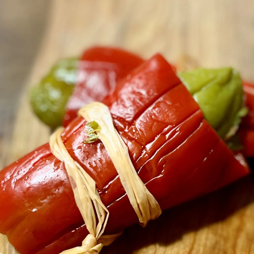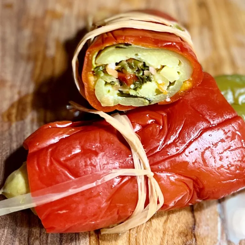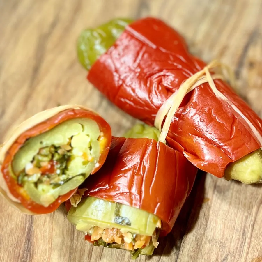 Delikatne kawałki bakłażana wypełnione są aromatycznym farszem warzywnym, który nadaje im wyrazisty, lekko pikantny i ziołowy charakter.