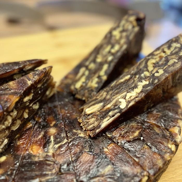 Naturalna słodycz daktyli nadaje mu głęboki, karmelowy charakter, a chrupiące kawałki orzechów włoskich wprowadzają przyjemną strukturę i delikatną, lekko gorzkawą nutę.