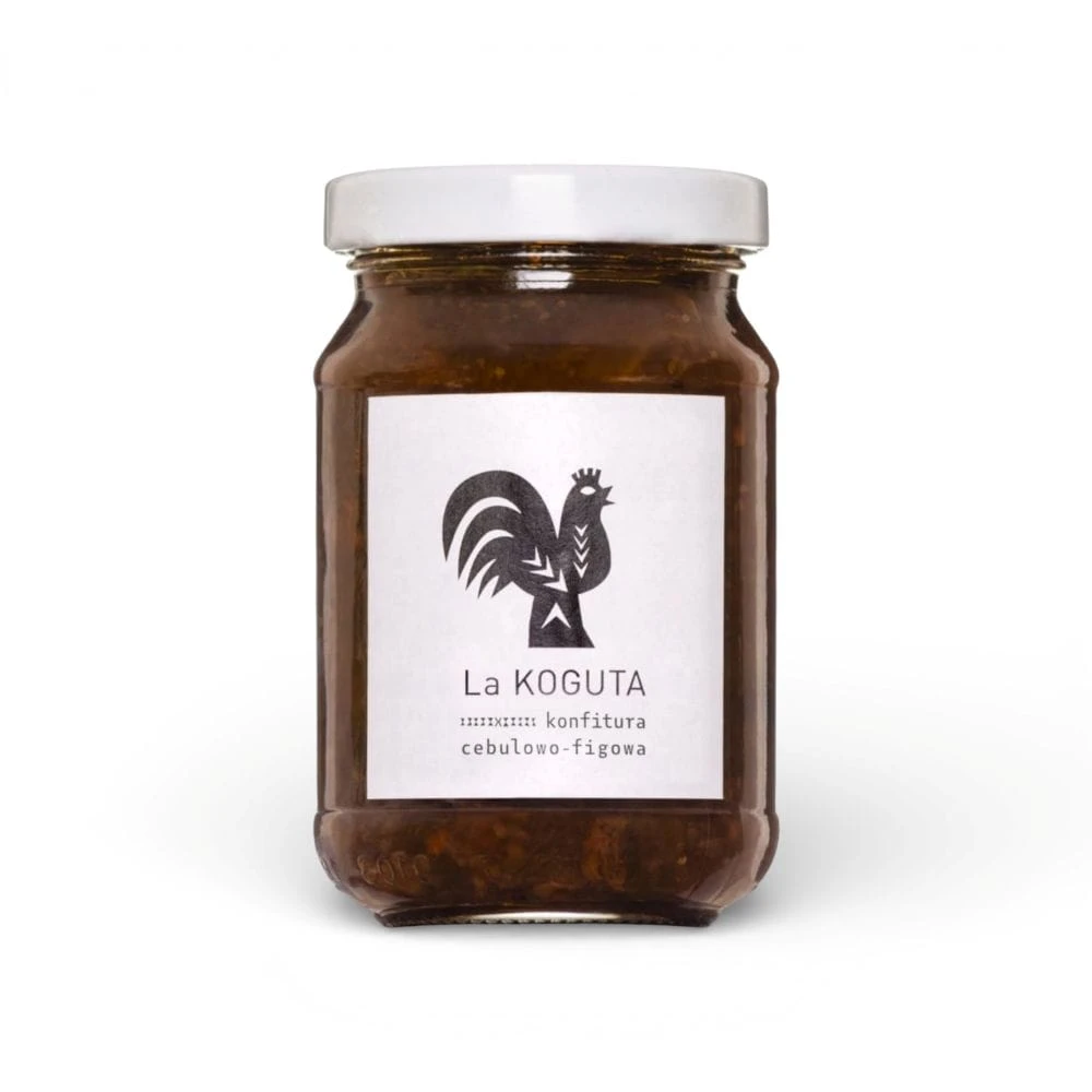 Konfitura cebulowo-figowa La Koguta to rzemieślniczy produkt przygotowany z cebulą (ok. 43–48%) i figami (ok. 7%), doprawiony czarnym pieprzem, solą oraz odrobiną octu jabłkowego i soku z cytryny.