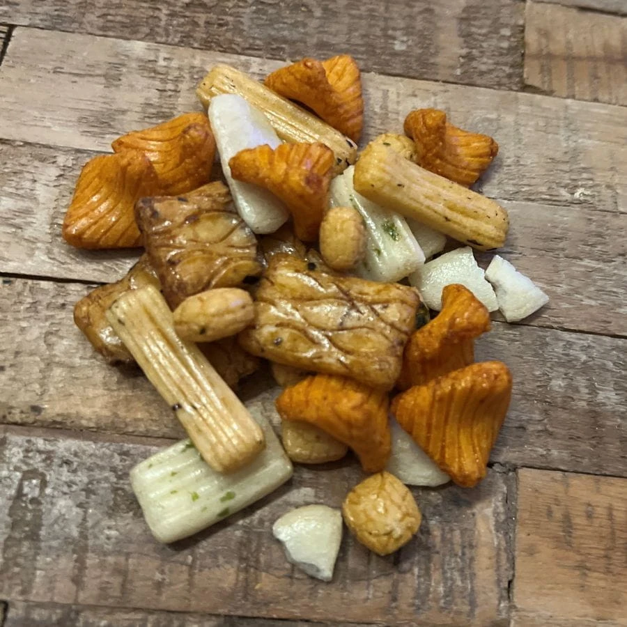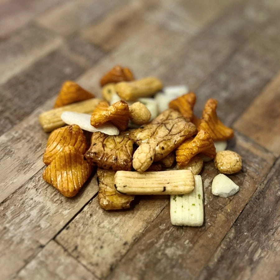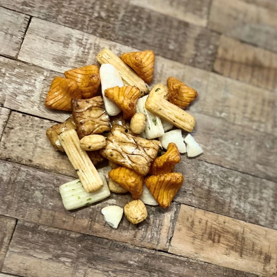 Tego typu snack mixy są charakterystyczne dla kategorii japońskich przekąsek ryżowych (arare i senbei), cenionych za lekkość, chrupkość i bogactwo form oraz smaków.