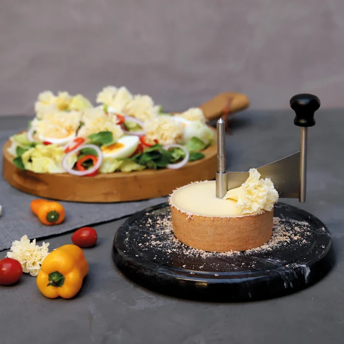 Elegancka strugarka do sera Tête de Moine z marmurową podstawą.