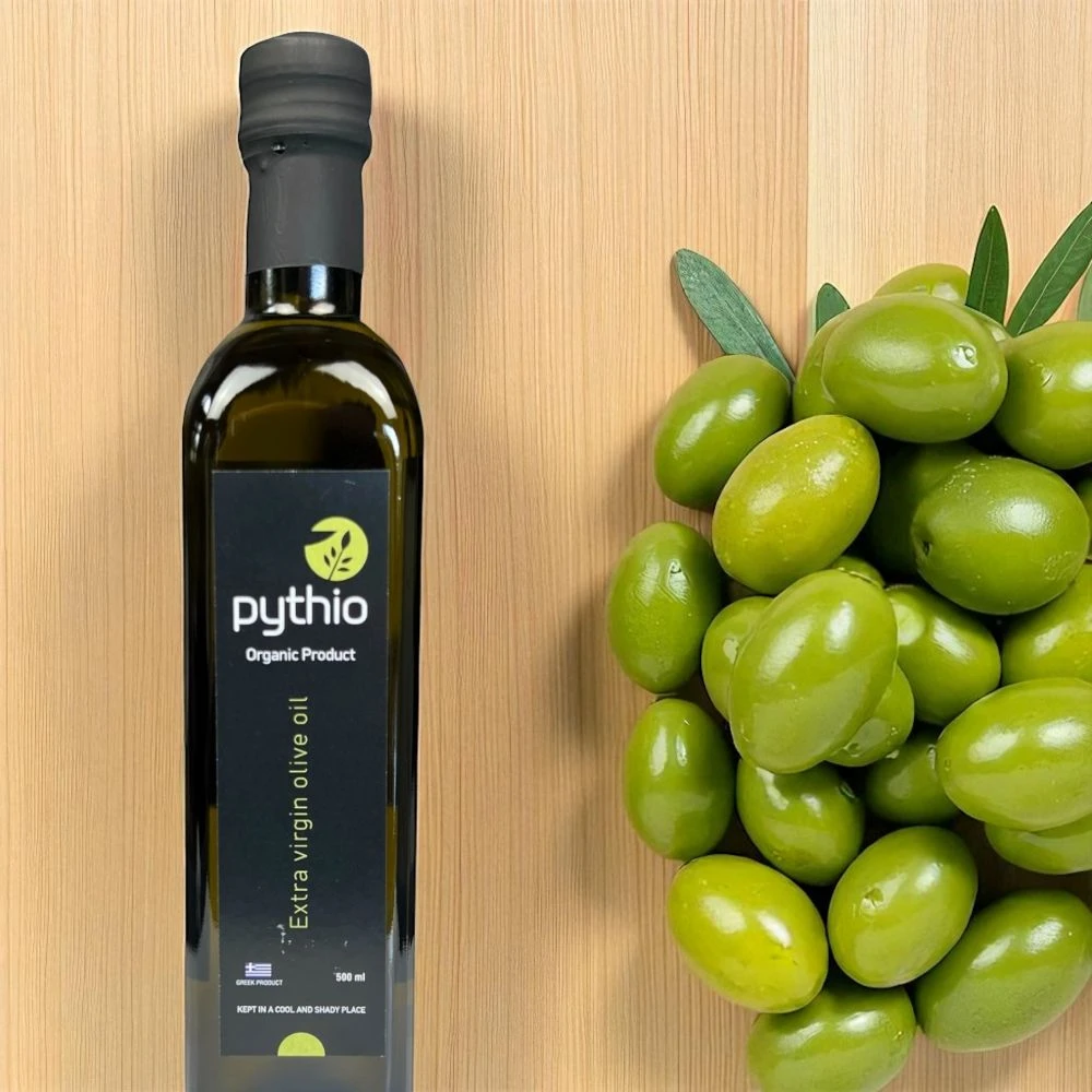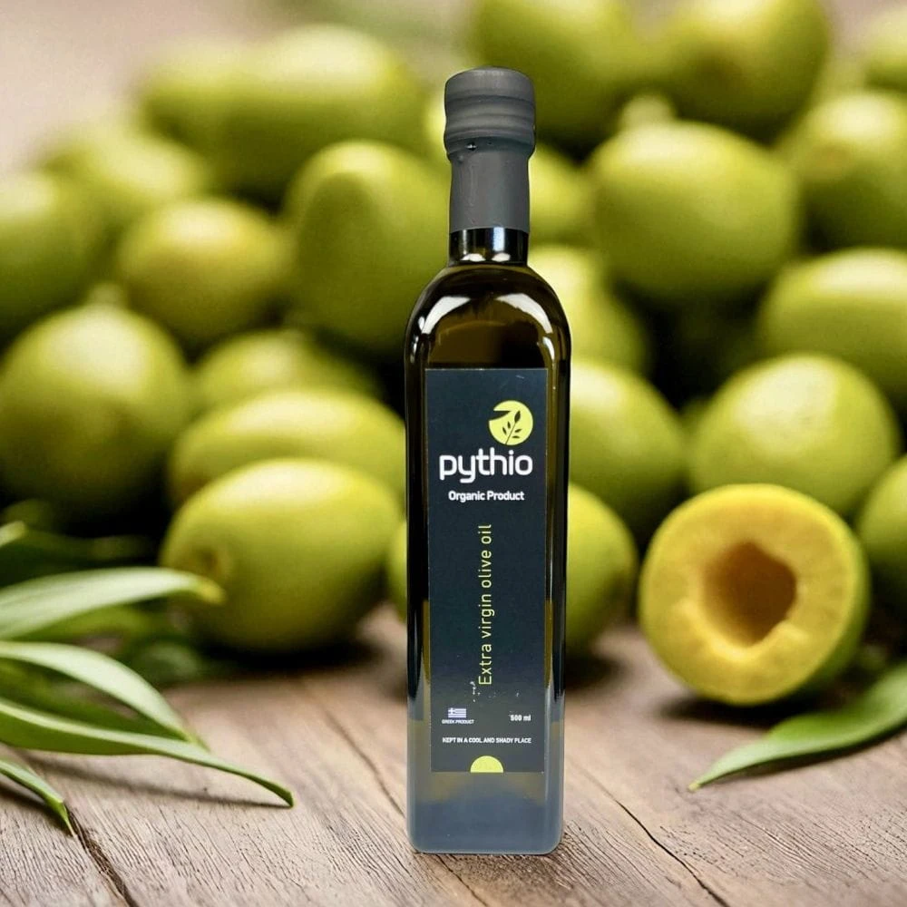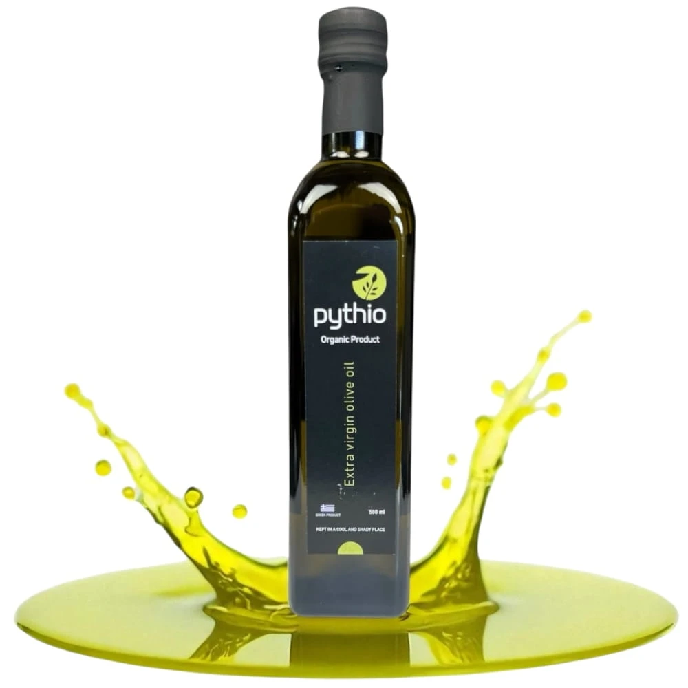 Oliwa extra virgin Pythio Organic to ekologiczna grecka oliwa najwyższej kategorii produkowana z oliwek pochodzących z certyfikowanych upraw organicznych.