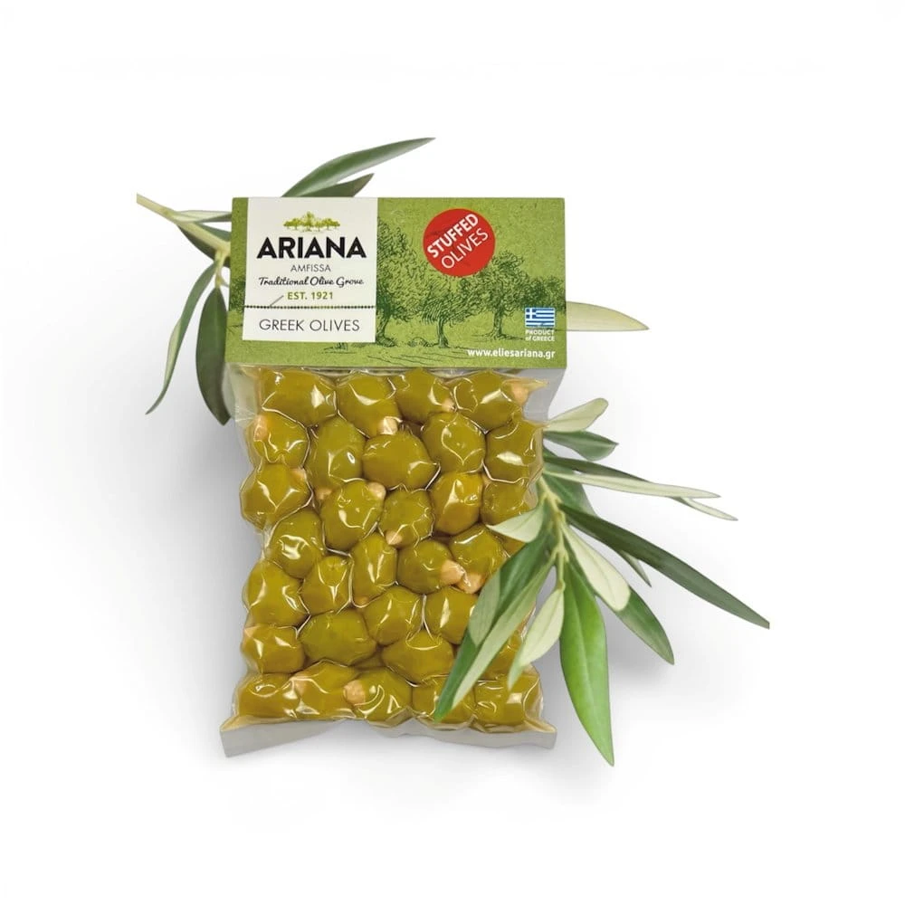 Zielone oliwki Ariana nadziewane migdałami powstają z odmiany Chalkidiki — jednej z najbardziej cenionych greckich odmian oliwek, szczególnie polecanej do nadziewania dzięki dużemu rozmiarowi, jędrnej strukturze i łagodnemu smakowi.