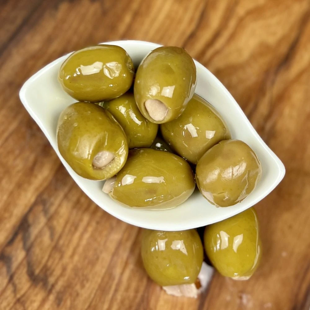 Aromatyczne nadzienie czosnkowe podkreśla naturalny charakter oliwek, nadając im wyrazisty, śródziemnomorski profil smakowy.