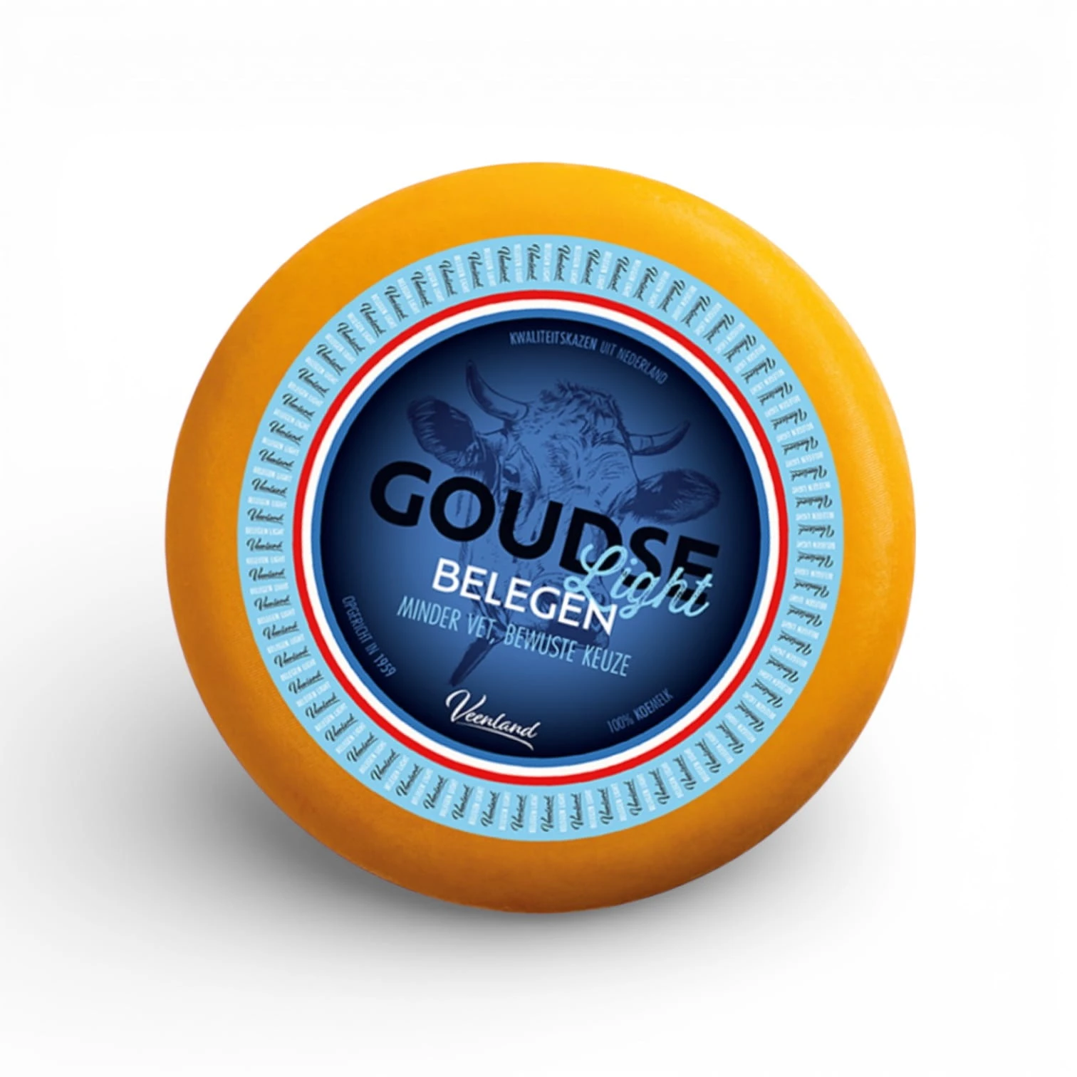 Gouda Light Belegen Veenland to półtwardy holenderski ser o obniżonej zawartości tłuszczu i pełnym, lekko pikantnym smaku typowym dla dojrzewającej goudy.