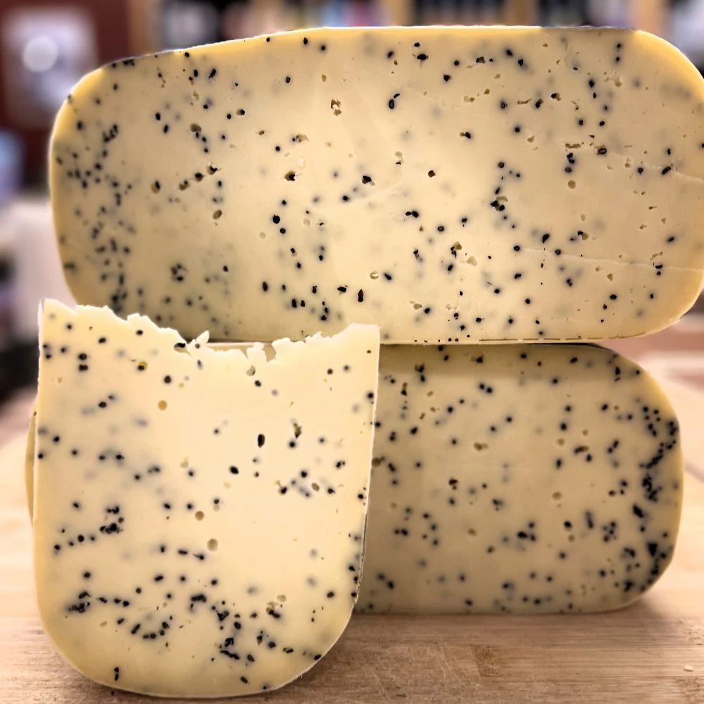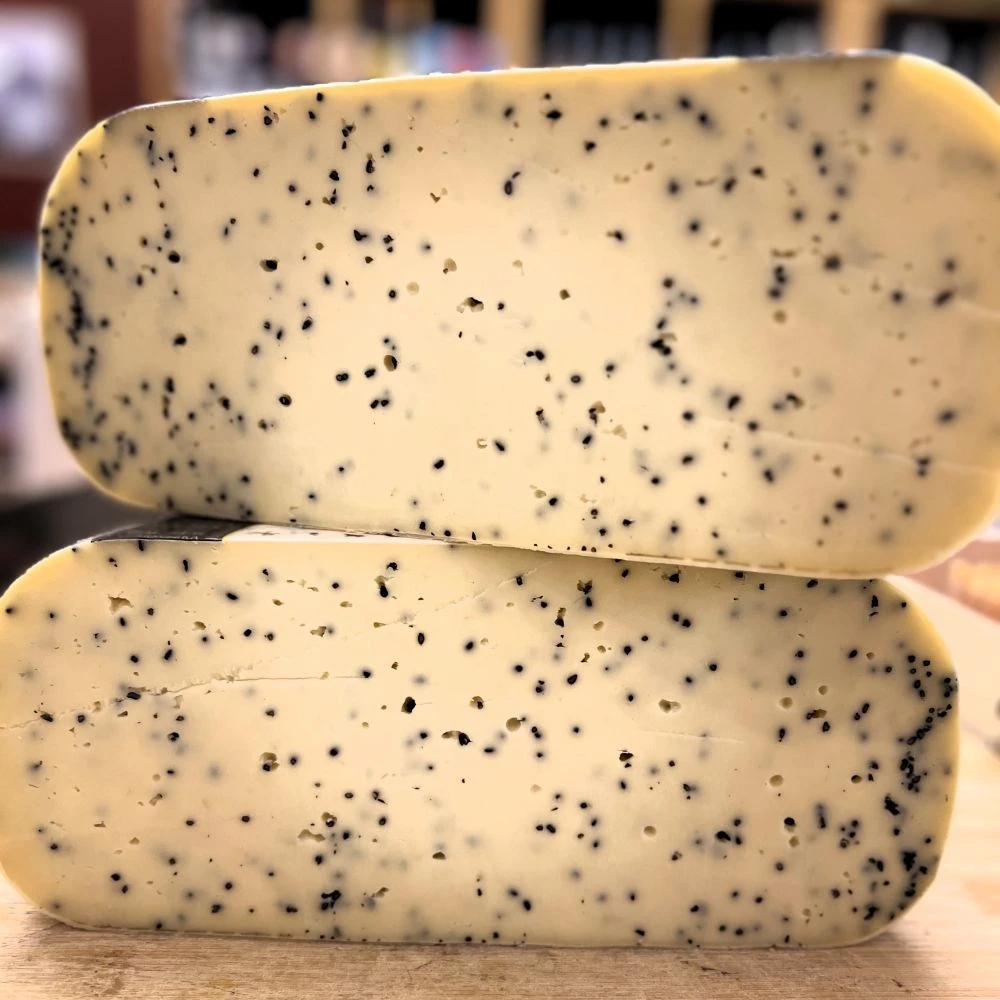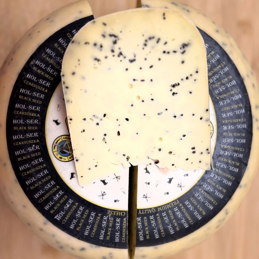 Gouda z czarnuszką to aromatyczny, dojrzewający ser krowi o łagodnym, maślanym smaku z delikatnie pikantną nutą czarnuszki.