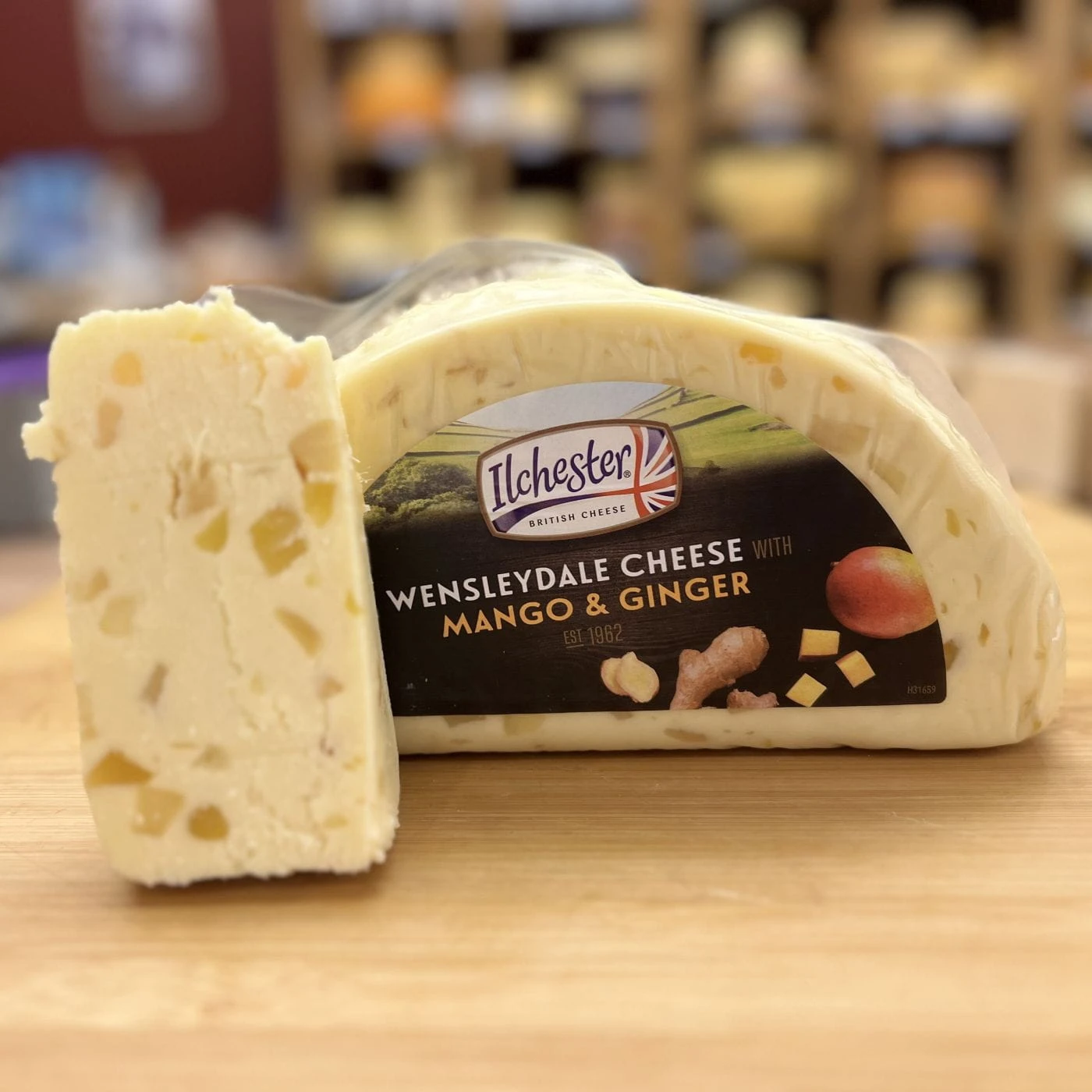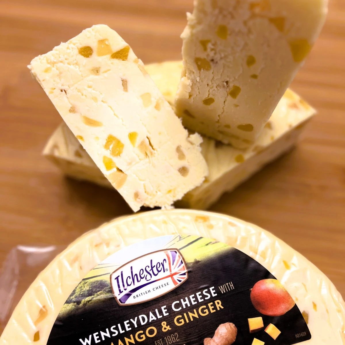 Ser Wensleydale, pasteryzowane mleko krowie, sól, podpuszczka mikrobiologiczna, skrystalizowany imbir 13% (imbir, cukier trzcinowy, substancja konserwująca dwutlenek siarki), kultury bakterii kwasu mlekowego, mango 7% (cukier trzcinowy, mango , kwas cytrynowy,