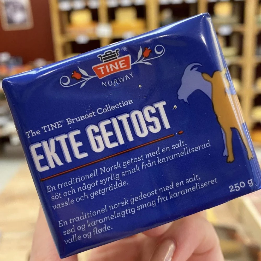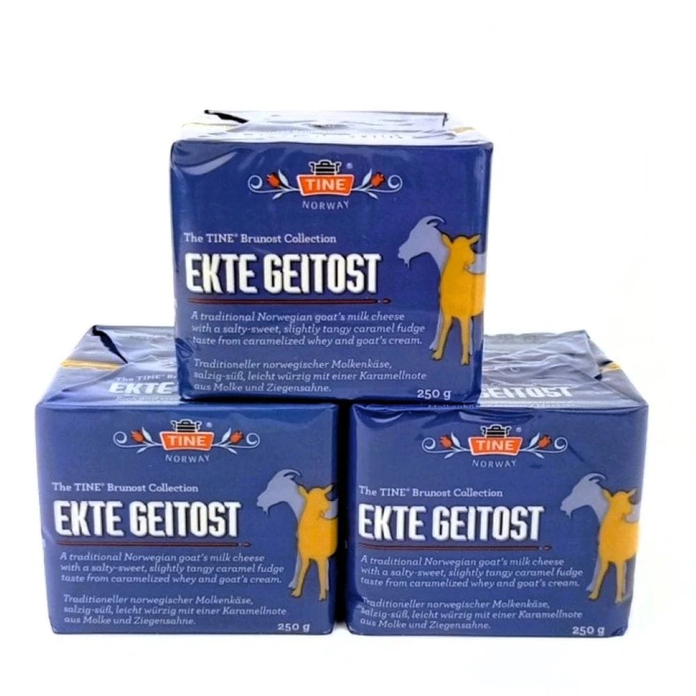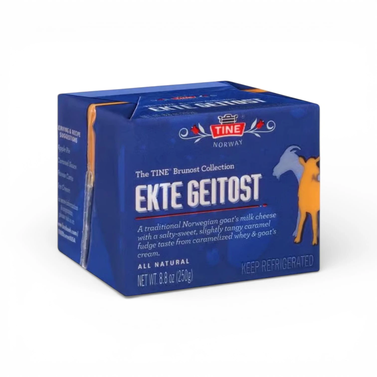 Ekte Geitost, oznaczający „prawdziwy ser kozi”, to tradycyjny norweski brunost produkowany przez TINE z serwatki i mleka koziego.