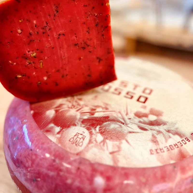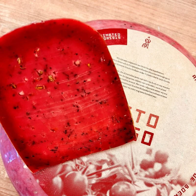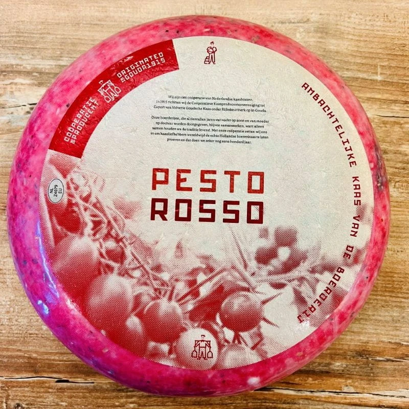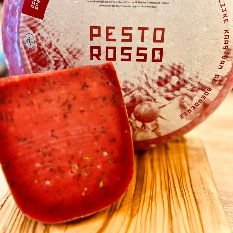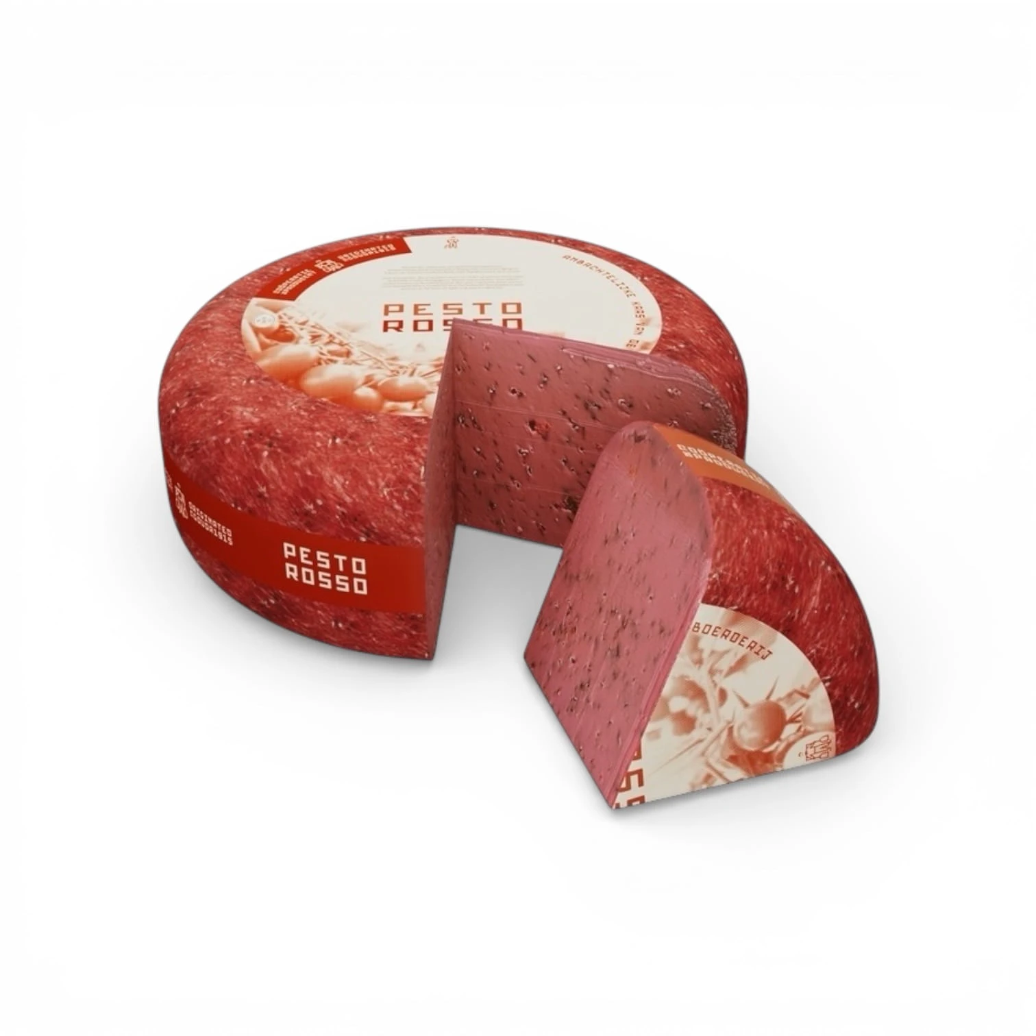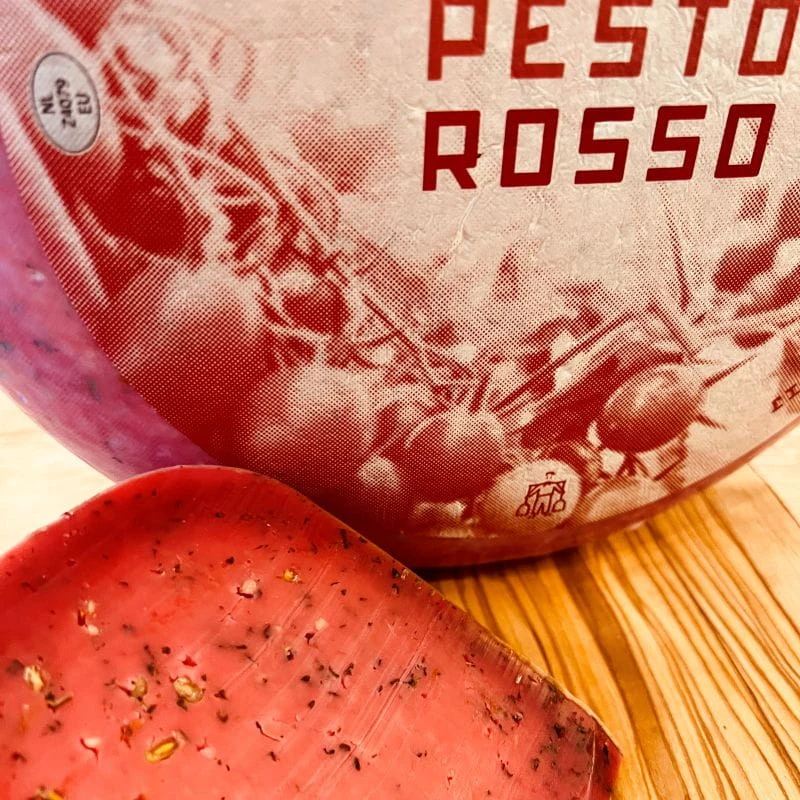 Pesto czerwone to półtwardy ser dojrzewający z mleka krowiego, wzbogacony pikantną mieszankę czerwonych ziół pesto, w tym pomidora, czosnku, bazylii, kozieradki i nutę płatków chili.