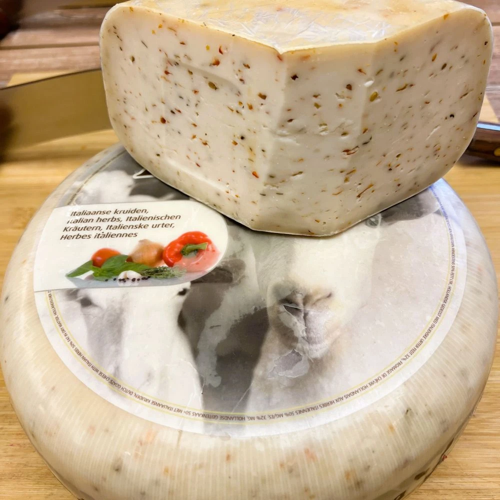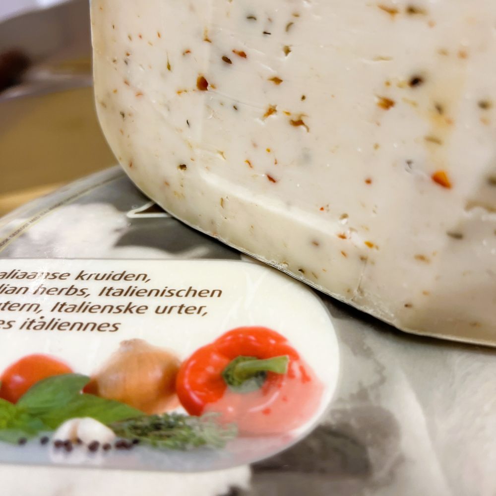 mleko kozie pasteryzowane, sól, mieszanka włoska 0.8% (papryka, czosnek, bazylia, cebula, tymianek, pieprz cayenne), podpuszczka mikrobiologiczna, kultury bakterii kwasu mlekowego.