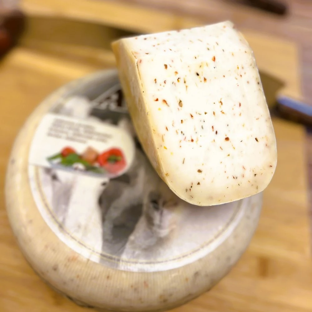 Dodatek ziół włoskich – takich jak bazylia i tymianek – przenika strukturę sera, nadając mu śródziemnomorski charakter.