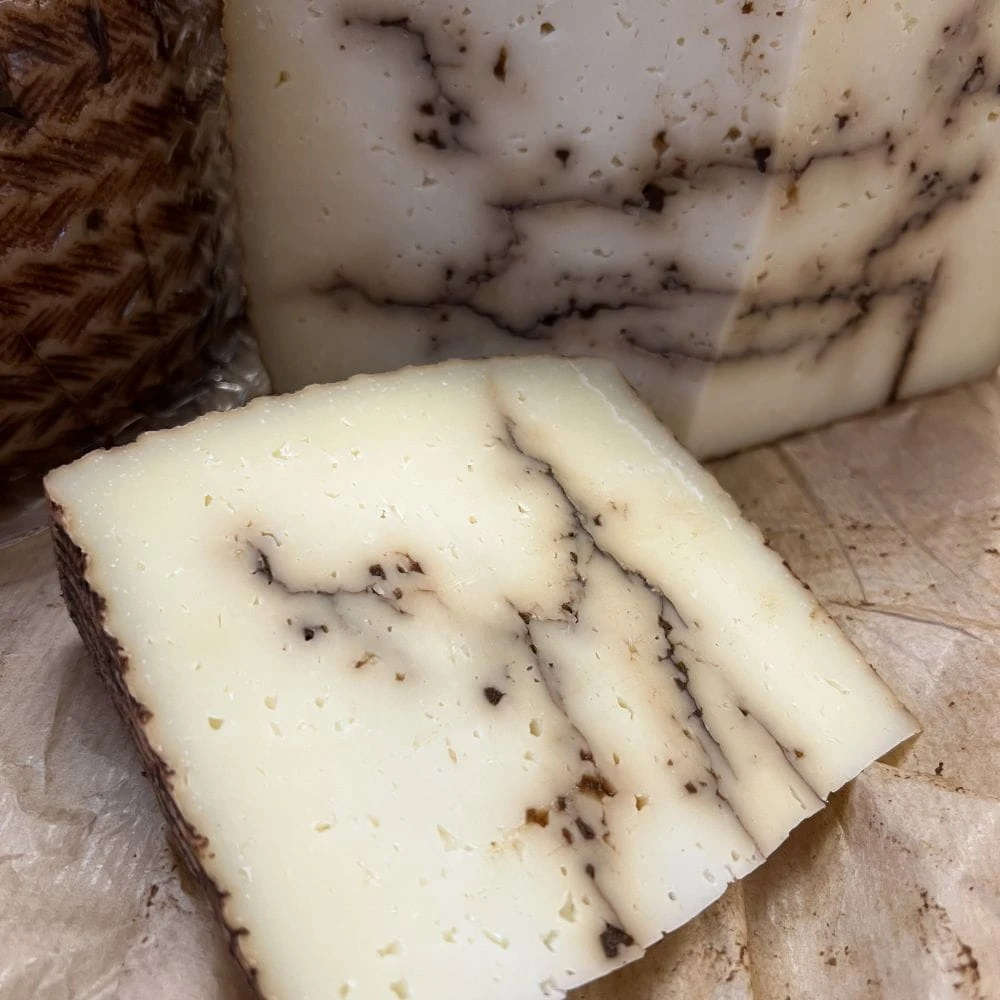 Do masy serowej dodawany jest czarny czosnek, który tworzy charakterystyczne ciemne żyłki w przekroju oraz nadaje serowi subtelną słodycz, nuty balsamiczne i delikatny posmak umami.
